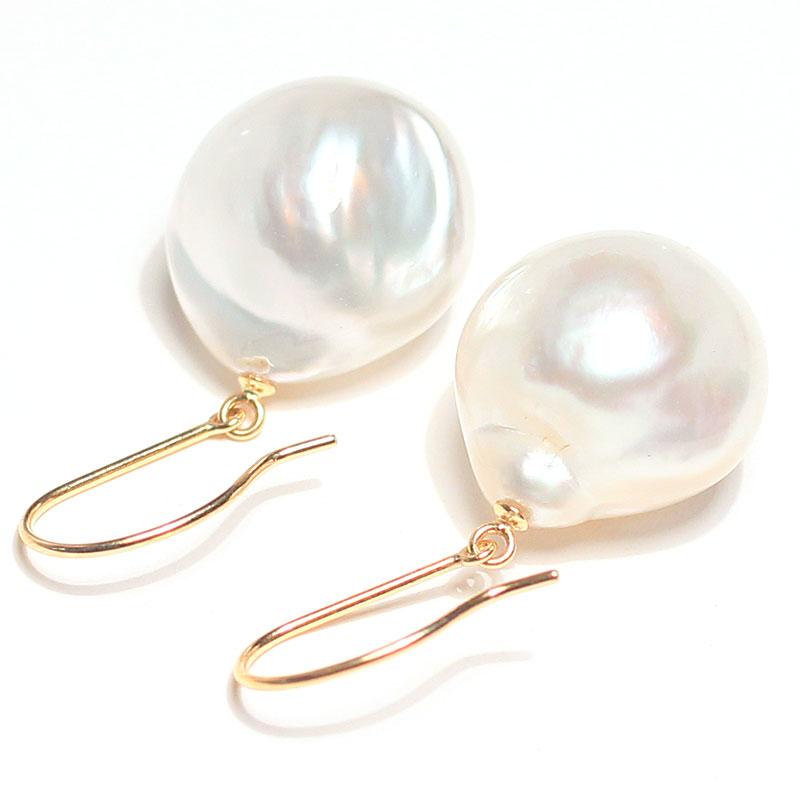 近年市場に多く出回るようになったバロックピアス。人工的に見えてしもう真円よりもより自然な仕上がりを生かしたバロックの方が良い、という方が増えてきています。あまりにいびつなバロックパールでは結婚式には不向きかもしれませんが、このように人の手を加えられていない円形はかえって品があります。